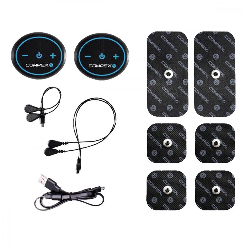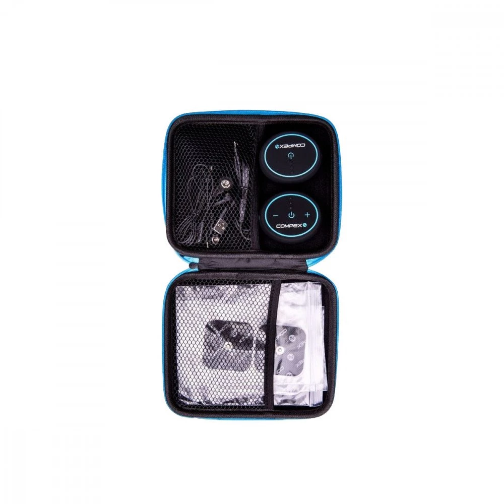 Contenuto della confezione: 2 Moduli Wireless Compex Mini, 4 elettrodi piccoli, 2 elettrodi grandi, 1 set di cavi corti, 1 set di cavi corti, 1 cavo di ricarica USB e una custodia protettiva per il trasporto.